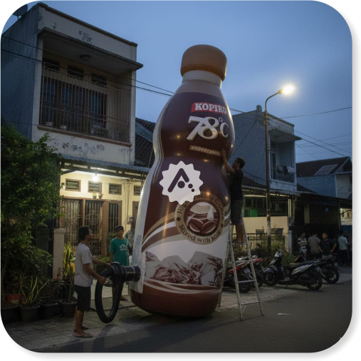 Balon ini dibuat menggunakan bahan khusus yang kuat dan ringan sehingga dapat berdiri tegak atau mengembang dengan bantuan blower atau udara. Selain itu, balon dapat dicetak dengan logo, warna brand, serta informasi produk sehingga berfungsi sebagai media promosi yang sangat efektif.