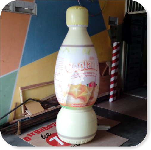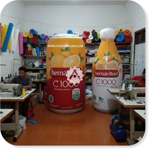 Balon produk botol dibuat mengikuti bentuk kemasan produk sehingga terlihat sangat menarik dan berbeda dari media promosi biasa.