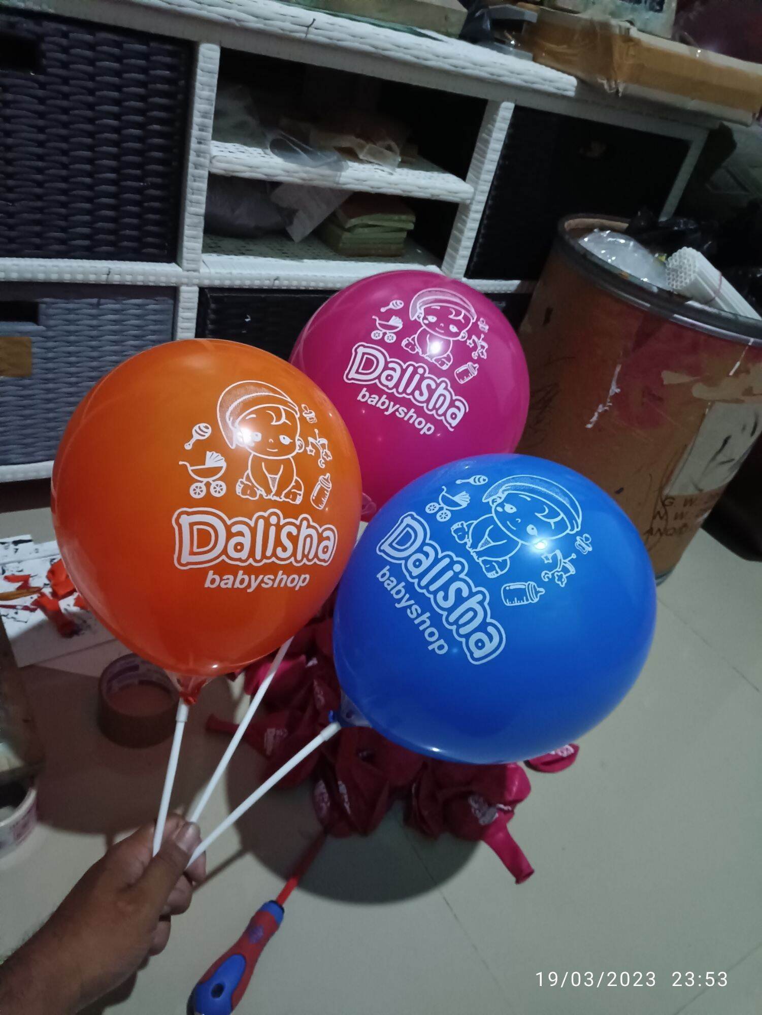 Balon dicetak menggunakan tinta khusus yang dapat menempel dengan baik pada permukaan balon.